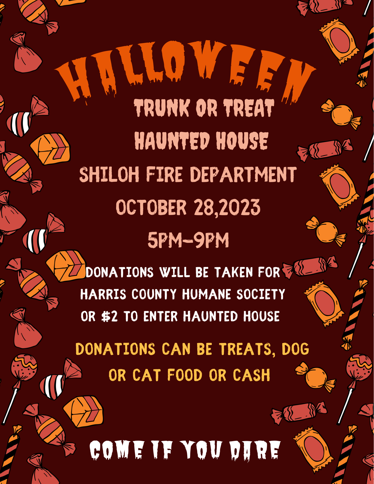 The Shiloh Volunteer Fire Dept. will host their annaul Trunk or Treat and Haunted House on Saturday, October 28th beginning at 5:00 p.m.